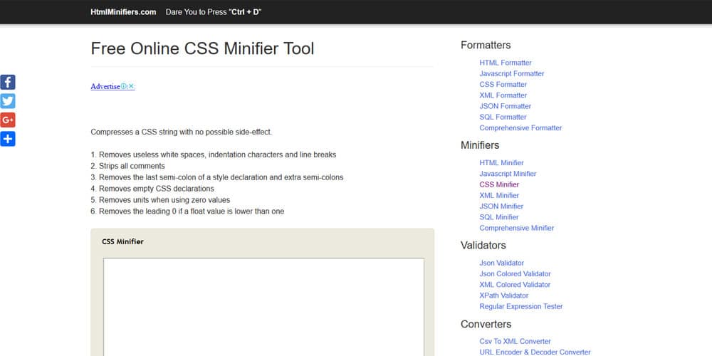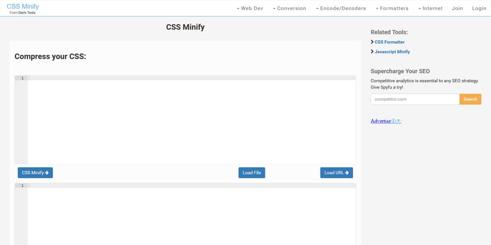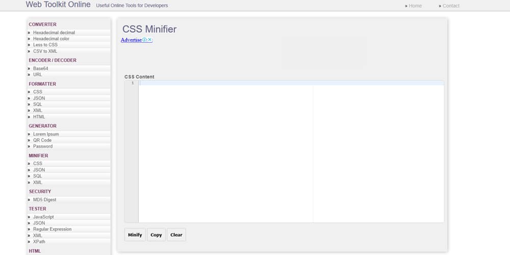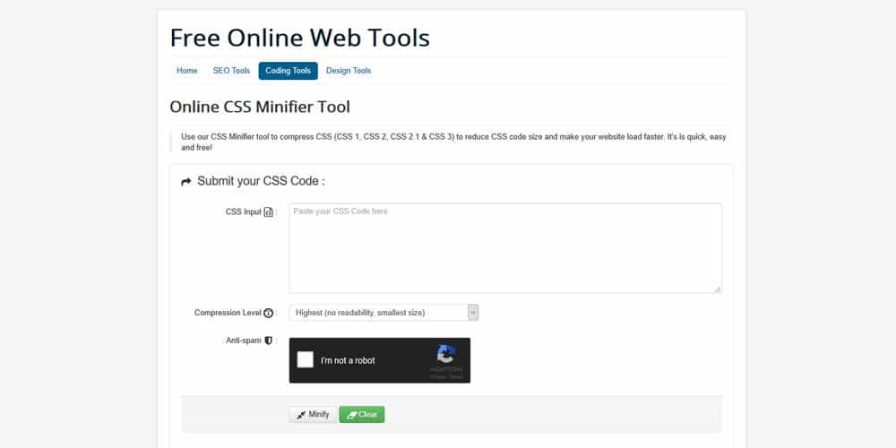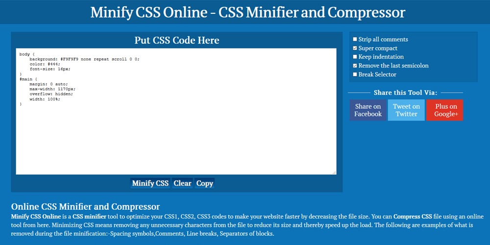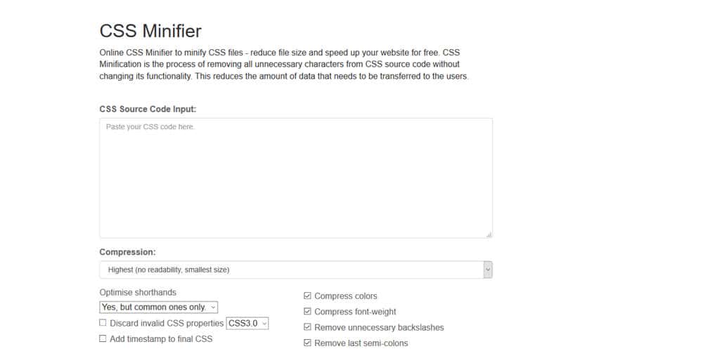 ПерейтиCSS minifier для оптимизации вашего CSS-кода, чтобы сделать ваш сайт быстрее, уменьшив размер файла.