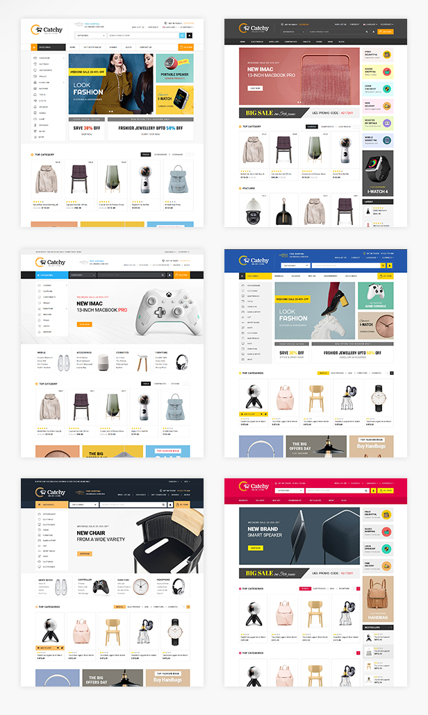 Тема Catchy OpenCart специально разработана для мегамаркетов, магазинов электроники, ювелирных изделий, косметики, дизайнерской одежды, магазинов красоты, мебели, бытовой техники, детских товаров и универсальных магазинов.
