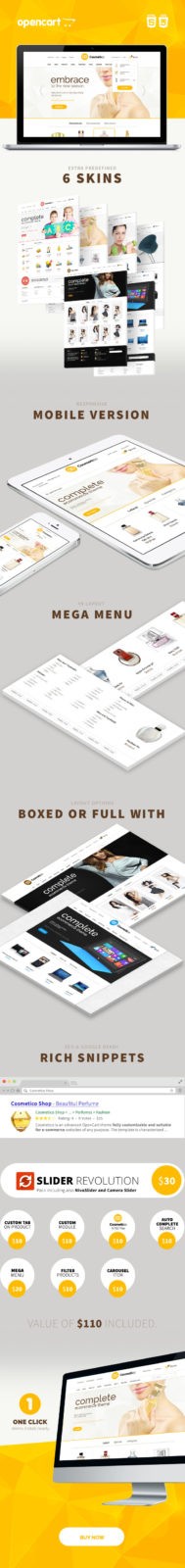 Cosmetico — это продвинутая тема OpenCart, полностью настраиваемая и подходящая для сайтов электронной коммерции любых целей. Шаблон характеризуется универсальностью, привлекательностью и легкой настройкой. С градиентами, неограниченными цветами и GoogleWebFonts вы можете создать свой магазин мечты через несколько минут. Кроме того, мы создали для вас 5 базовых цветных версий, которые вы можете редактировать. Шаблон не только визуально привлекателен, но также использует новейшие тенденции в кодировании с использованием html5, css3 и bootstrap 3.