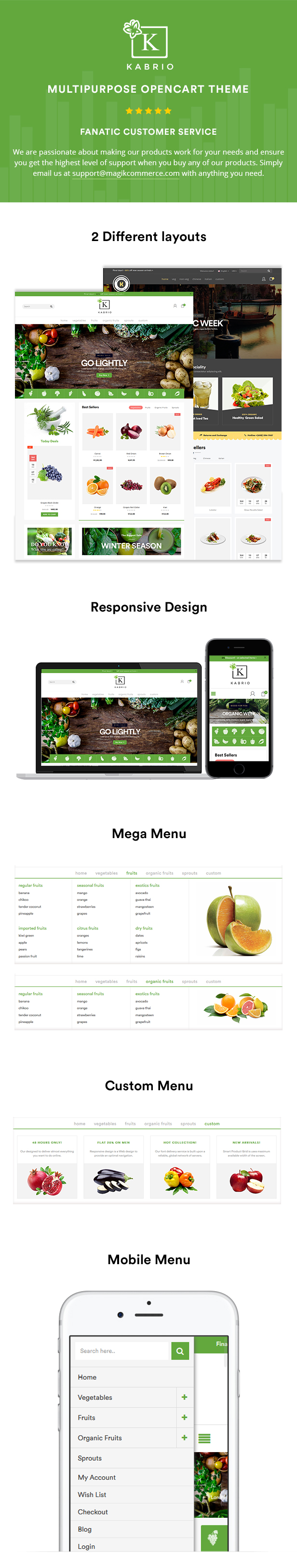 Food OpenCart Theme / Food OpenCart Template: Kabrio is a responsive OpenCart template designed for all stores, supermarkets and businesses selling frozen food, packed food, ready-to-eat items, snacks, confectionery and other related products. It is packed with the best-in-class features as well as a suite of powerful extension that is offered free. This is speed and SEO-optimized Food OpenCart template.