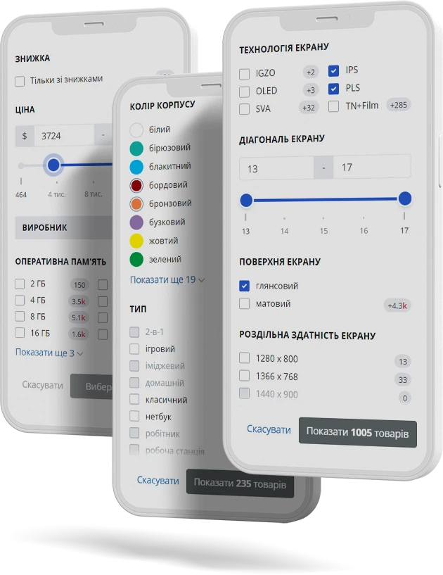 - Работа с большим количеством товаров (100к +) и фильтров;