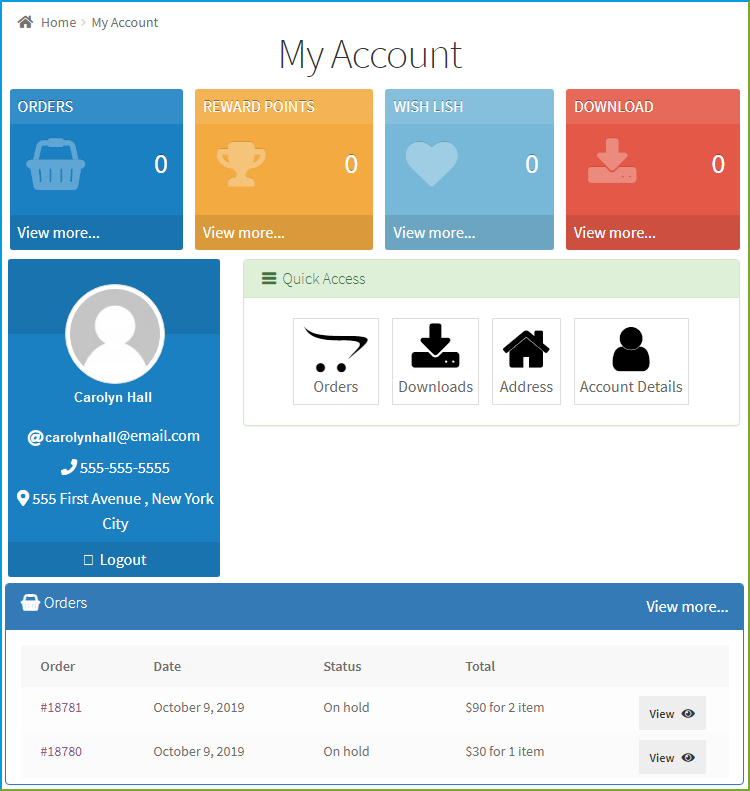 Превратите стандартные страницы WooCommerce «Моя учетная запись» в полнофункциональную современную панель управления для клиентов: добавьте виджеты для заказов, списков желаний, бонусных баллов, загрузок и кредитов магазина. Отобразите раздел быстрого доступа, чтобы пользователи могли переходить к любому разделу своей учетной записи, и отображать покупки и загрузки в удобной для сканирования таблице, чтобы клиенты могли сразу просмотреть все свои недавние действия.
